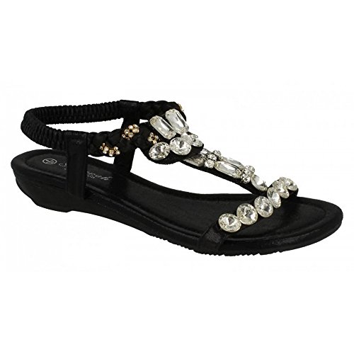 Womens t bar sandals with decorative jewels. Ideal for casual fashion summer wear. Plaited and elasticated sling strap. Outer material: synthetic. Inner material: manmade. Sole: manmade. Heel type: mid wedge heel. Shoe width: regular. Choice of three colours.